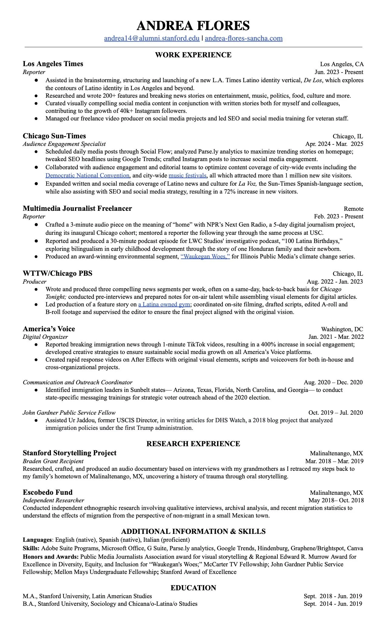 Andrea Flores is a multimedia journalist with experience reporting fast break and feature stories, creating engaging social media content and producing audio podcasts. In 2023, she contributed to the launch of De Los at the Los Angeles Times, a vertical exploring the diverse contours of Latino identity in Los Angeles and beyond.